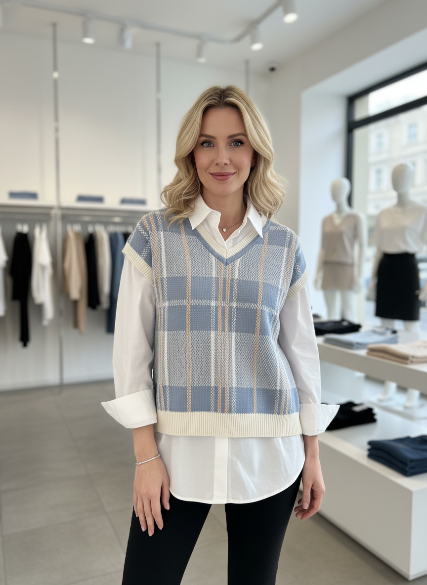 Ontdek de perfecte balans tussen comfort en verfijning met dit tijdloze, gebreide vest. Het subtiele ruitenpatroon geeft een verzorgde uitstraling die moeiteloos past bij jouw dagelijkse elegantie.