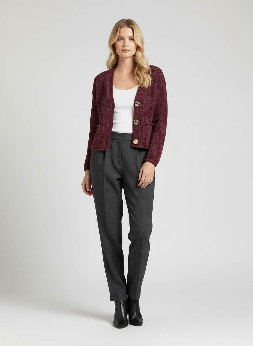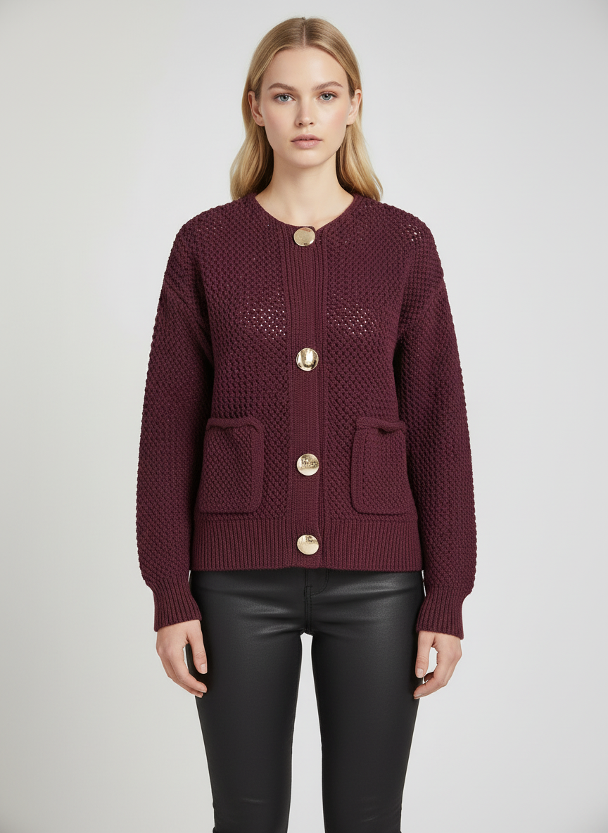 Zacht Gebreid Vest in Bordeauxrood met Gouden Knopen