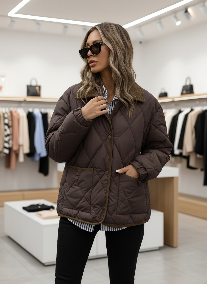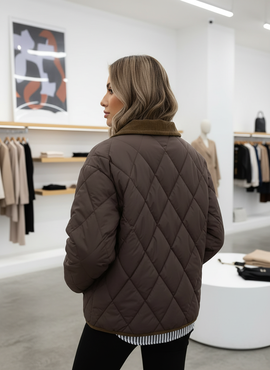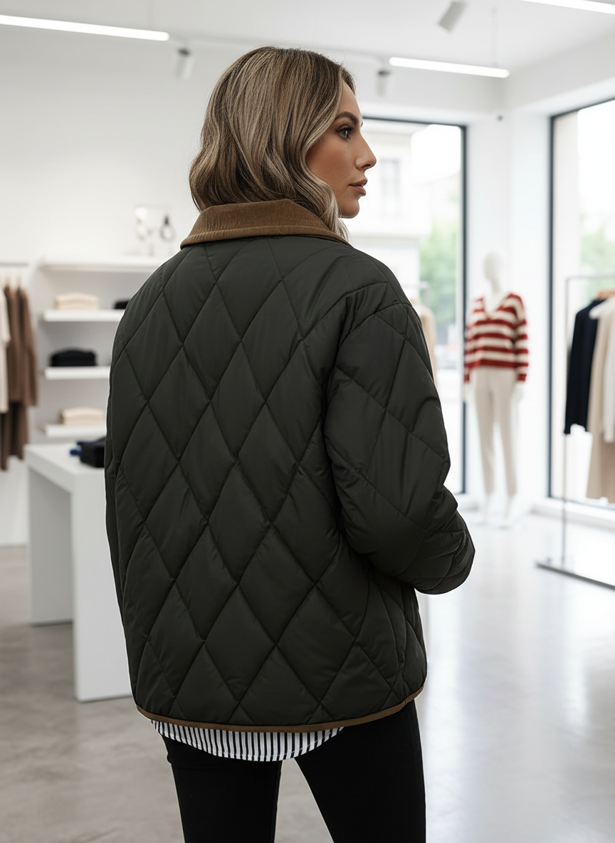 Stijlvol: Het kenmerkende diamantstiksel en de verfijnde corduroy kraag geven een luxe uitstraling.