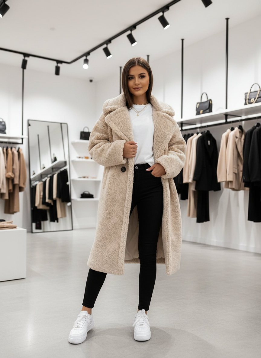 Ervaar de perfecte samensmelting van luxe textuur en een moeiteloos oversized silhouet. Deze jas is uw nieuwe ankerstuk voor de koudere seizoenen, ontworpen voor de vrouw die comfort eist zonder in te leveren op haar verzorgde uitstraling.