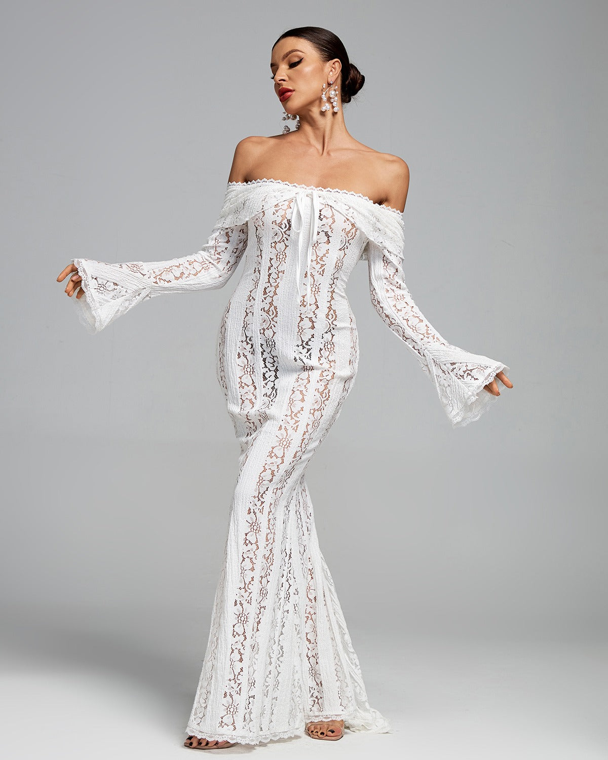 Voel je elegant in de Verfijnde Kanten Off-Shoulder Maxi Jurk.