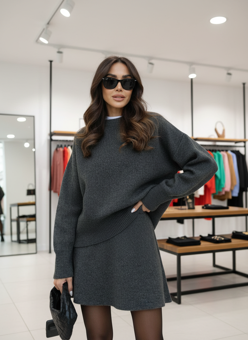 Bestaande uit een oversized trui en een perfect passende mini-rok.